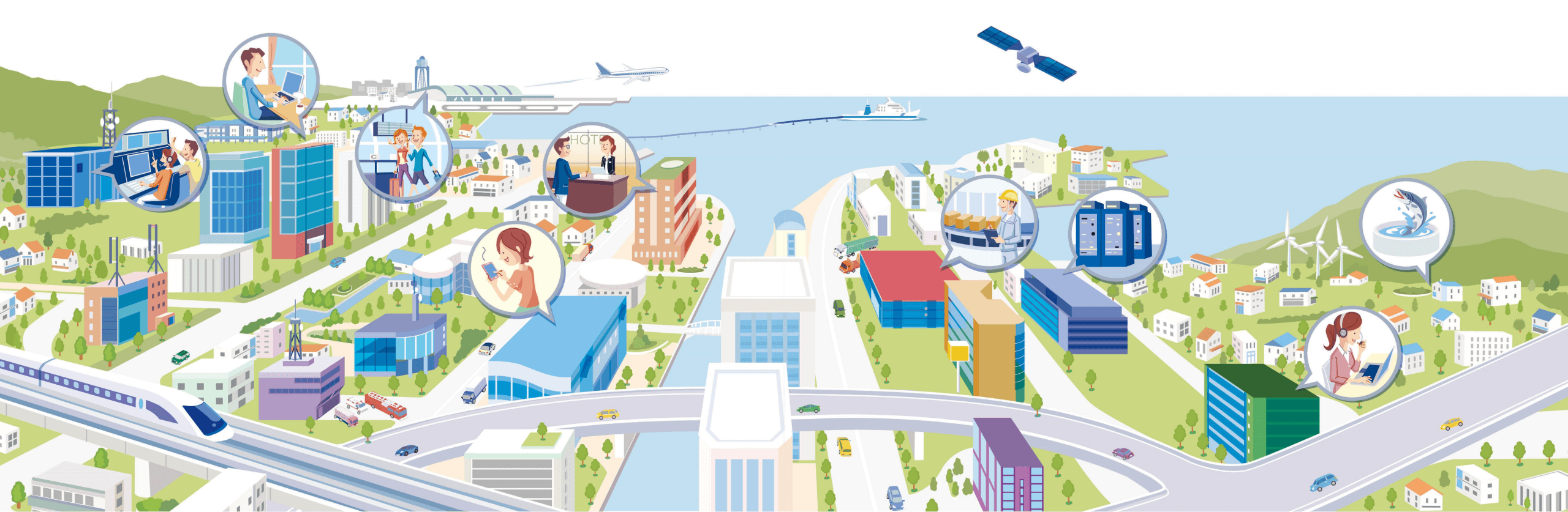 企業・工場・学校など多様な現場に向けてICTソリューションを提供。テレワークやオンライン授業、リモートワークの環境構築に加え、スマートファクトリーやスマートシティの実現にも貢献しています。