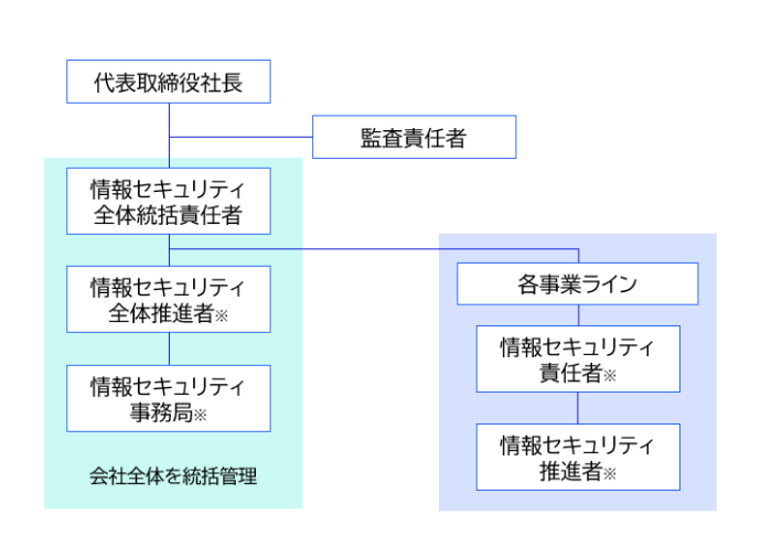 当社は、情報セキュリティの維持・向上のため、代表取締役社長の指示の基、「情報セキュリティ全社統括責任者」、「情報セキュリティ全体推進者」を設置し、各事業ラインの情報セキュリティ責任者および情報セキュリティ推進者へ情報セキュリティポリシーの周知徹底、情報セキュリティの重大な脅威の発生に対する適切な対応策および再発防止策の策定、情報セキュリティポリシー監査の実施などの活動をしています。