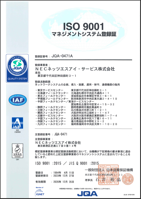 NECネッツエスアイ・サービスは、JQA外部審査にてマネジメントシステムの適正な活動が確認され「ISO9001」を認証取得しております。