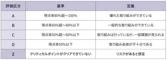 2023年度は協力を依頼したTier1にあたる1,294社のうち1,194社から回答を得て、調達取引先の取り組み状況を「得点率」および「クリティカルポイント*2」の評価基準に照らして、点検テーマ単位にA、B、C、D、Zの5段階で評価しました。