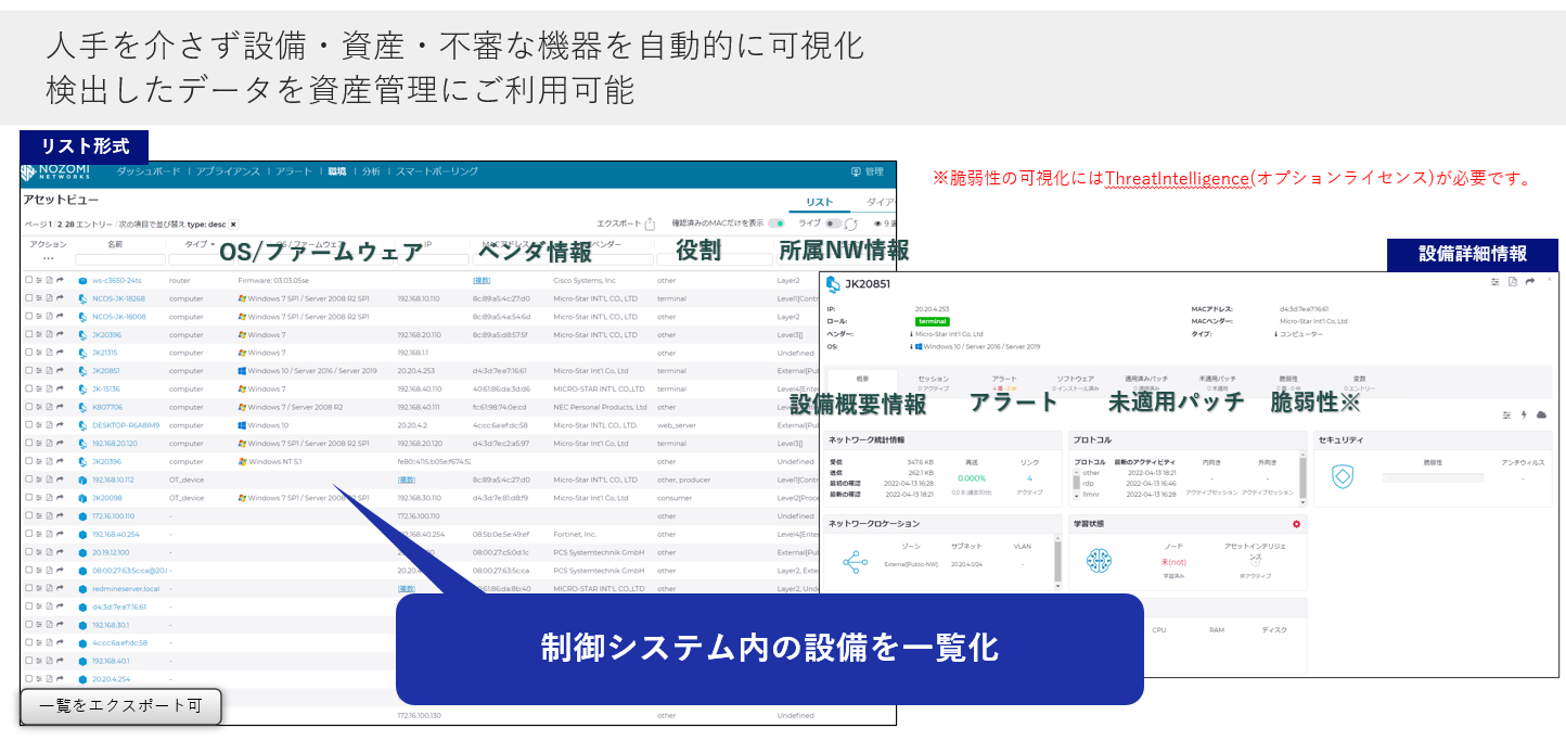 人手を介さず設備・資産・不審な機器を自動的に可視化します。検出したデータを資産管理にご利用いただけます。