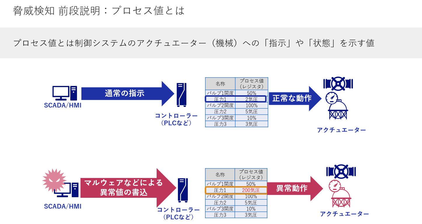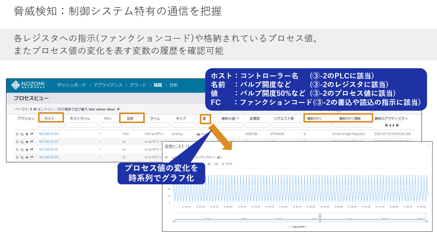 通信をモニタすることで自動的にプロセス値の変化を学習/ポリシー化して制御システムを監視し、マルウェアや操作ミスなどでポリシーに違反するようなプロセス値の変更があった場合に検知を行います。