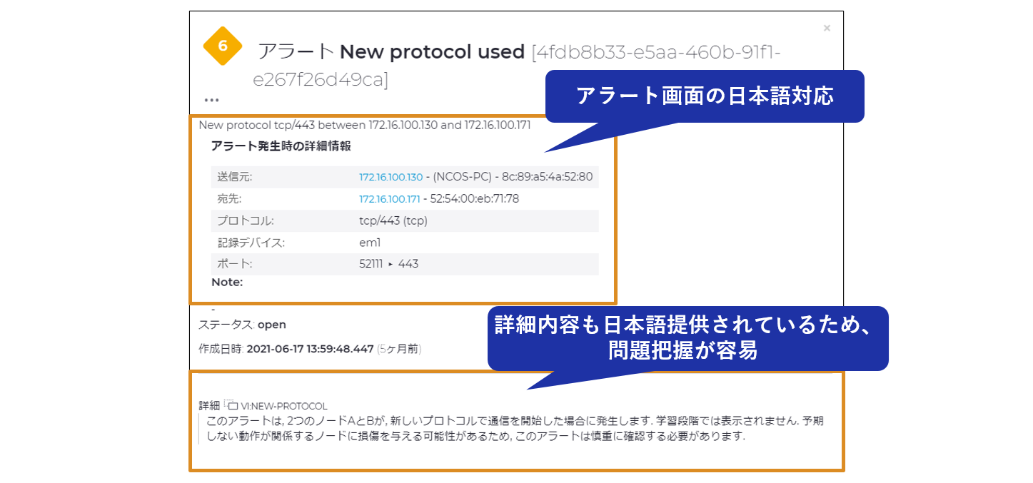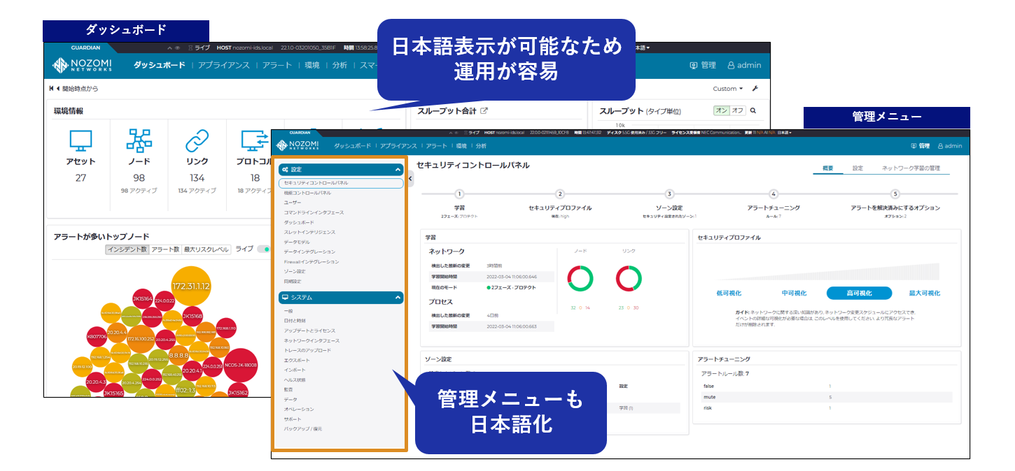 ダッシュボードや管理メニューなどのGUIは日本語表示が可能なため運用が容易です。アラート画面も日本語に対応しており、問題把握も容易に行えます。